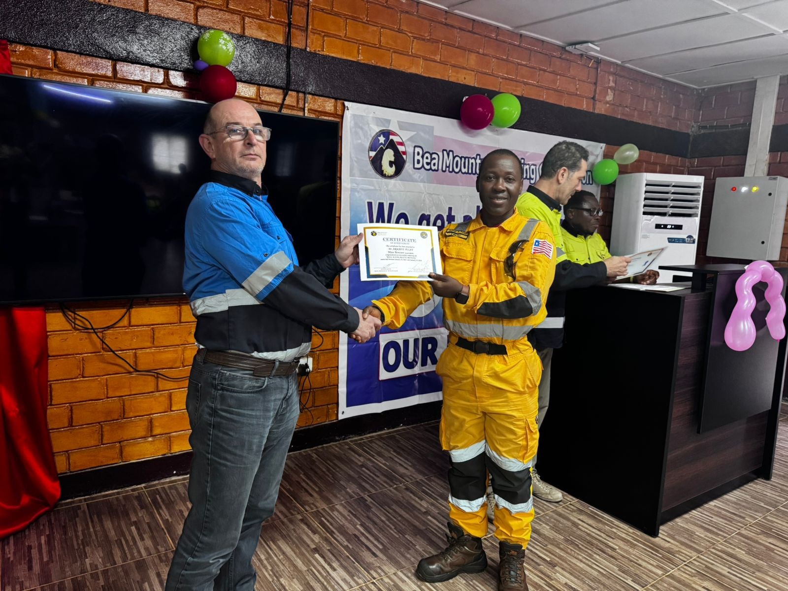 The graduation ceremony, held at the Camp David Recreation Center at the New Liberty Gold Mine in Kinjor, Grand Cape Mount County, celebrated 14 Liberian workers who completed a rigorous year-long training program designed to prepare them for emergency rescue operations in mining environments.
