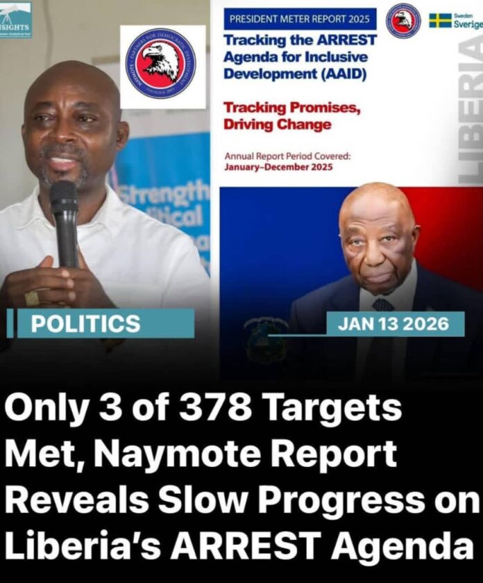 Only three of the 378 planned interventions in Liberia’s ARREST Agenda for Inclusive Development (AAID) were fully implemented between January and December 2025, according to a recent assessment by civil society watchdog Naymote Partners for Democratic Development, raising grave concerns about the program’s effectiveness and pace.
