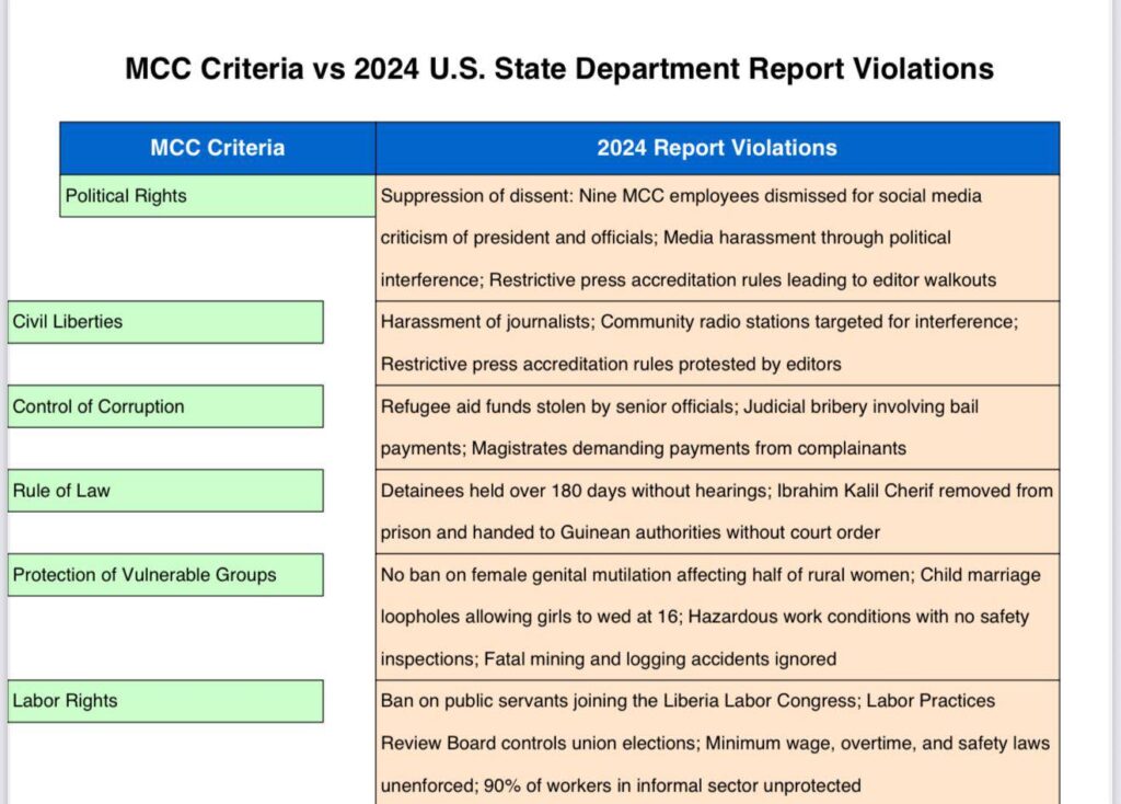 The MCC evaluates not just policy performance but also sustained commitments to democratic rights, anti-corruption, and protection of vulnerable groups. Critics argue that the documented violations in the 2024 report could place Liberia’s compact eligibility at serious risk, regardless of political statements to the contrary.